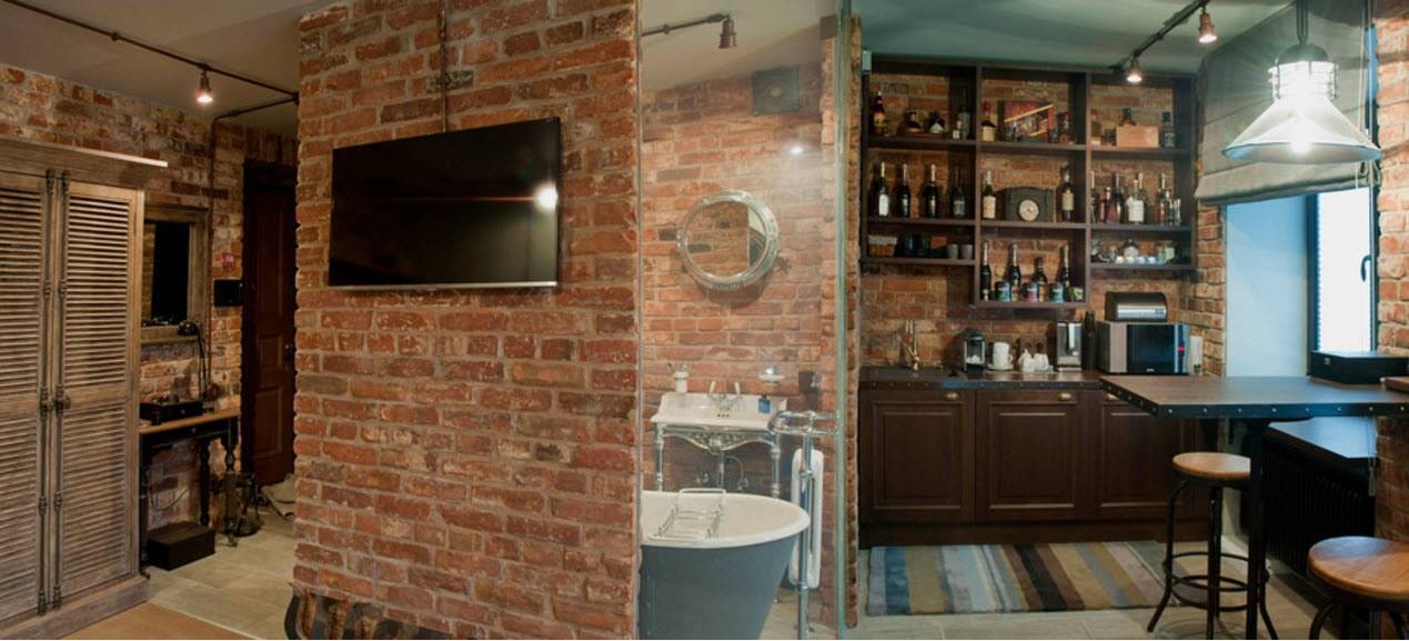 В отделке кухни, как и в гостиной, используются классические мотивы стиля лофт – натуральная древесная фактура и металл. Еще одним ярким фактурным акцентом стали кирпичные стены.