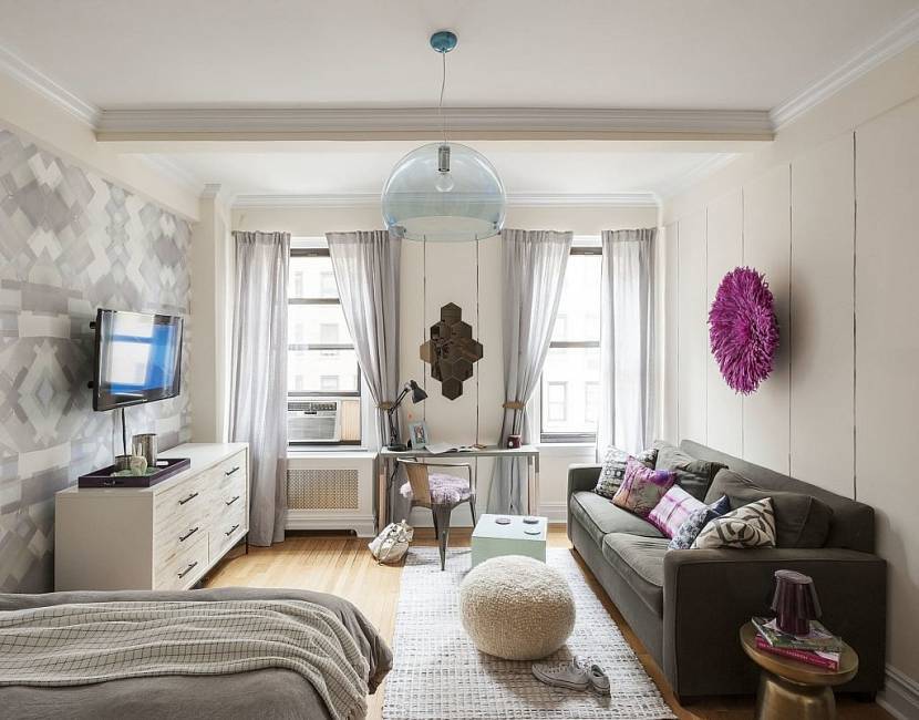 Аксессуары и мебель для маленького помещения должны быть функциональными и немногочисленными – только то, что действительно нужно для сна и гостиной. Минимализм позволит придать комнате больше света и пространства.