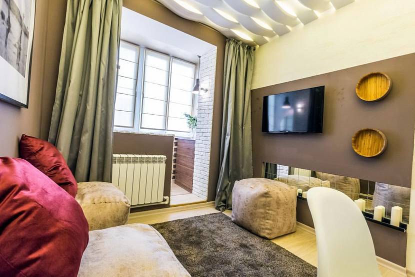 - Диван или кресла – этими предметами будет обозначена гостиная зона. Они должны быть компактными, чтобы не занимать много места.