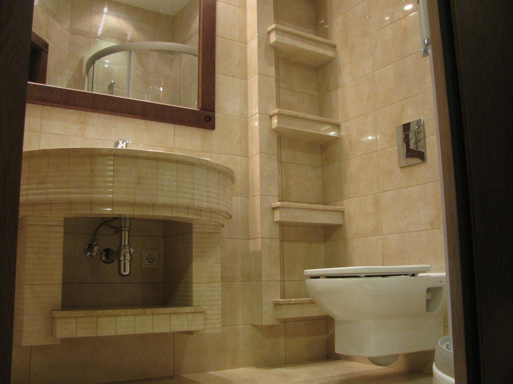 Практичным решением будет угловое расположение маленькой раковины. Над ней делают полочки, которые не будут мешать при перемещении по помещению.