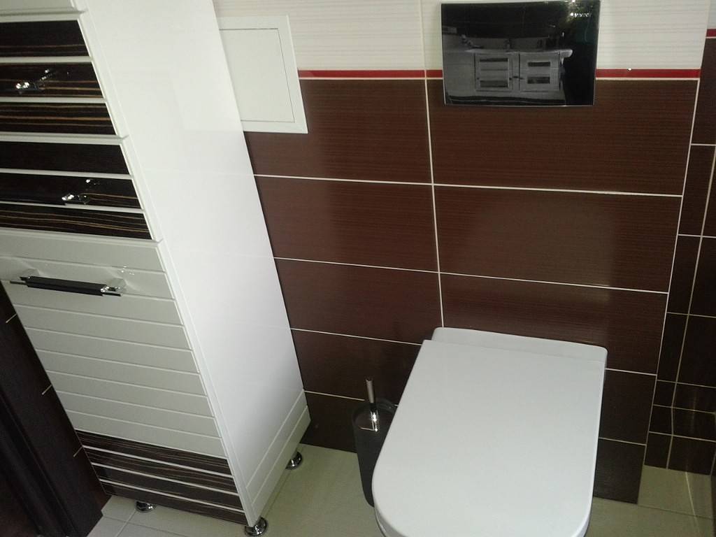 Если есть возможность, то лучше убрать перегородку между санузлом и ванной. Это увеличит площадь и место для интерьерных манёвров.