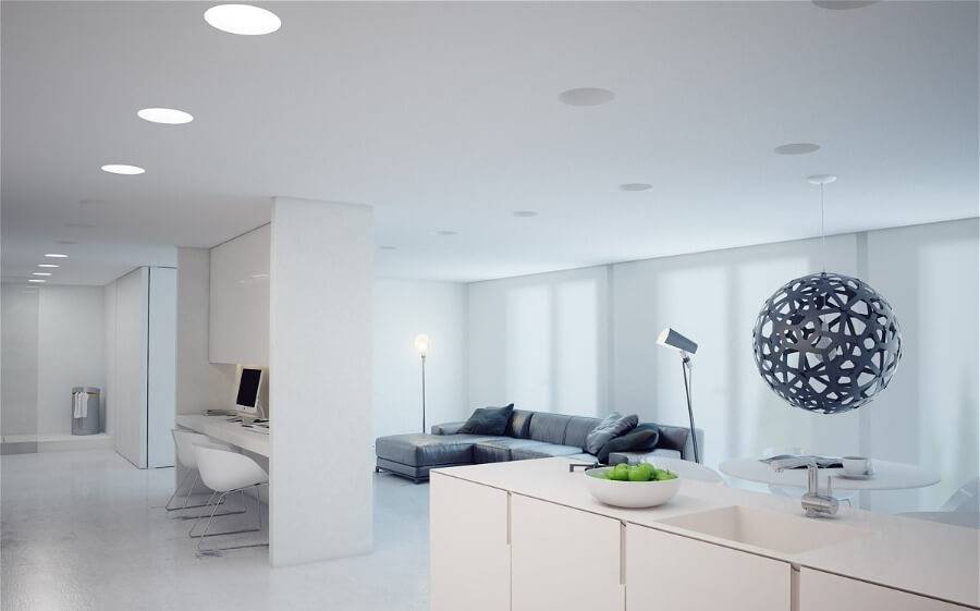 В гостиной, совмещенной с кухней, единая конструкция двухъярусного потолка служит для объединения двух зон в одно целое. Как и во многих других примерах, здесь используется глянцевая цветная округлая фигура, которую обрамляет белая матовая рамка. Выбранный для цветной части пастельный оттенок перекликается с тоном занавесок, и цветом кухонного гарнитура. Рамка используется для размещения точеных светильников, главным образом, отвечающих за освещение гостиной. Кроме того, в центре потолка имеется еще одна белая матовая вставка, на которой размещена необычная дизайнерская лампа.