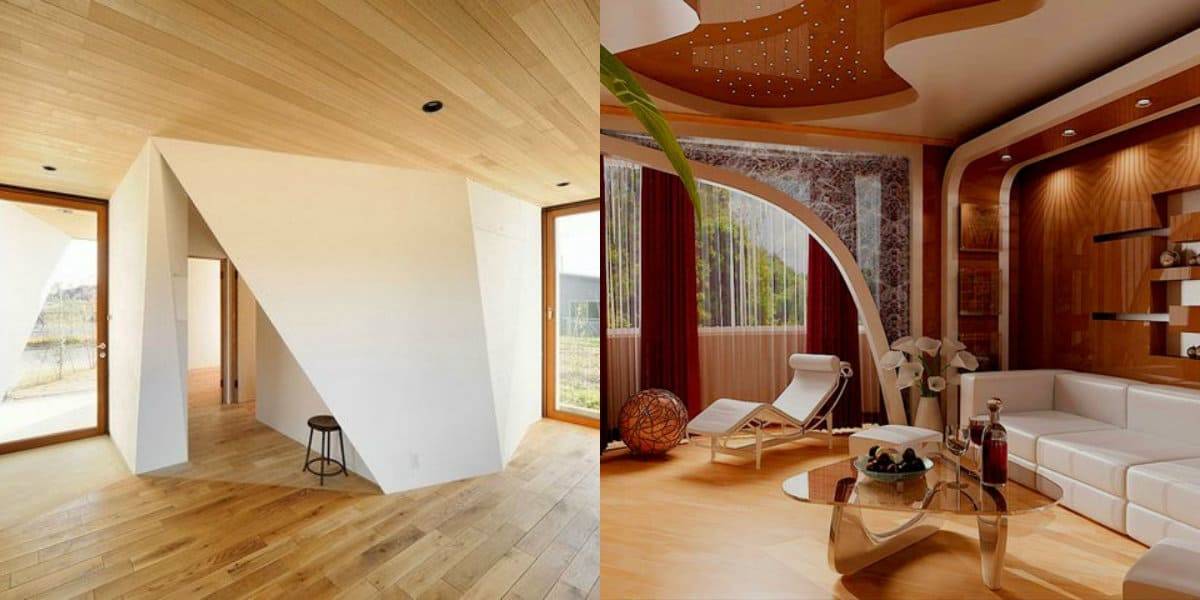 Очень эффектно и стильно будет выглядеть частичная отделка потолка деревом, которое «наползает» на него со стены. Если использовать толстые деревянные панели, можно создать интересную многоуровневую конструкцию.