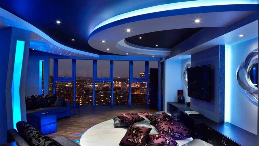 Этот осветительный прибор стал использоваться при отделке потолков сравнительно недавно. Главным преимуществом ленты является то, что вы можете выбрать не только тон освещения (холодный или теплый), но и оттенок света. Так что, если хотите немного поэкспериментировать, попробуйте установить синюю, фиолетовую или красную ленту. Некоторые модели способны сменять оттенки, добавляя волны или даже светомузыку.