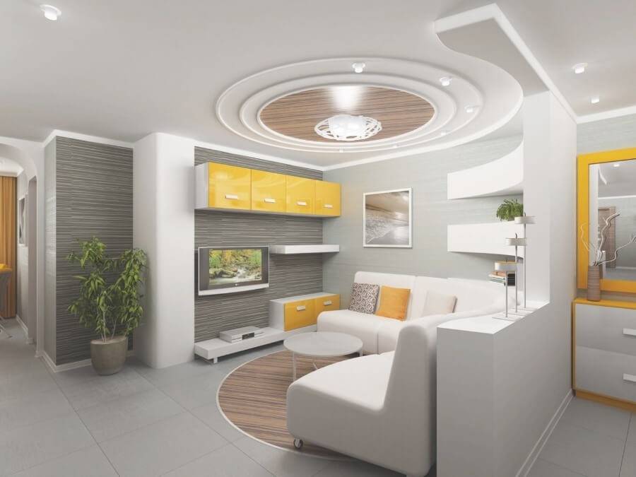 Многоуровневые подвесные модные потолки 2021 прекрасно подходят для зонирования гостиной или квартиры студии. При этом рекомендуется сочетать зонирование на потолке с зонированием на полу. Например, можно использовать различные напольные покрытия.