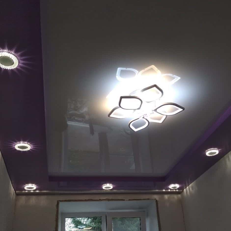 Первый уровень потолка представляет собой глянцевый полукруг лилового оттенка, расположенный в центре комнаты. Он отвечает за акцент комнаты и расширение пространства, кроме того, именно здесь размещается необычная дизайнерская люстра. Второй ярус, более спокойный, он опоясывает лиловую фигуру и является матовым.