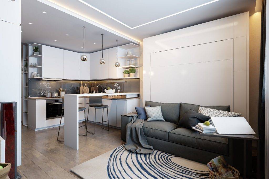На фото дизайн квартиры-студии 30 кв м, оборудованный кроватью-трансформером.