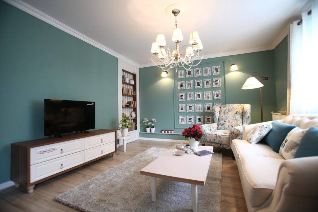 В гостиной, имеющей средние габариты, уместно применение универсальных белых, бежевых или серых оттенков в комбинации с другими тонами. В качестве напольного покрытия используют ламинатную доску или паркет, придающий интерьеру домашнего уюта. Стены облицовывают обоями или другим однотонным покрытием со слабовыраженным рисунком.