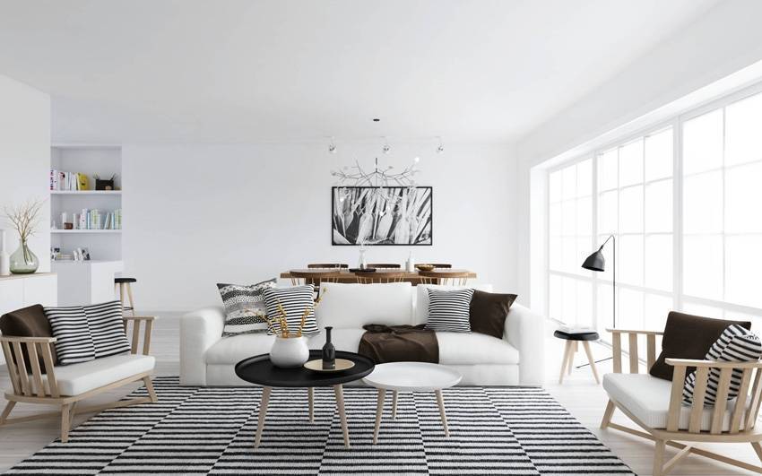 Отличное решение, соответствующее стилю минимализм – черно-белый принт, прекрасно гармонирующий со светлыми однотонными стенами. В качестве основного в жилой зоне можно выбрать белый цвет, который при желании может быть дополнен бежево-серо-голубыми вкраплениями. Немаловажный элемент интерьера подобных квартир – зеркала, которые расширяют пространство, добавляя света.