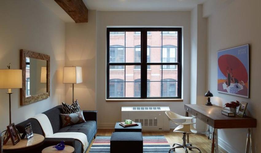 Нехватку естественного освещения, можно возместить искусственными приборами. Причем, в разных зонах они отличаются. Спальня предназначена для отдыха, поэтому применяется локальное освещение. Что касается рабочей зоны и кухни, то здесь устанавливается большое количество приборов. Так как света должно быть много. Для кухни хорошо подойдут точечные источники света, а гостиной — яркая люстра.