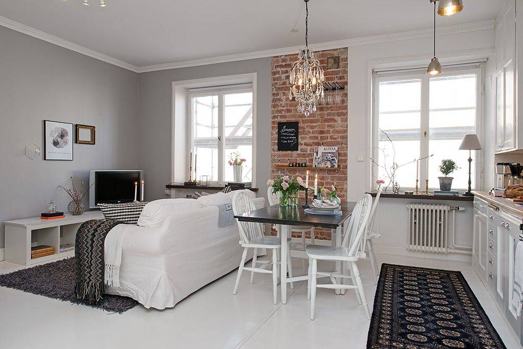 кухонную зону при возможности можно разместить в нише. Также иногда создают невысокую стационарную перегородку. Она непрозрачная, поэтому закрывает рабочую зону и не позволяет видеть гостям возможный беспорядок. Если возвести ее не до потолка, а на уровне роста, то она не будет препятствовать распространению света. Более того, такая перегородка делается не на всю ширину кухонной зоны. Со стороны кухни ее можно покрыть зеркальной поверхностью – это зрительно увеличит пространство, а с другой стороны – повесить телевизор, который станет центром гостиной зоны;