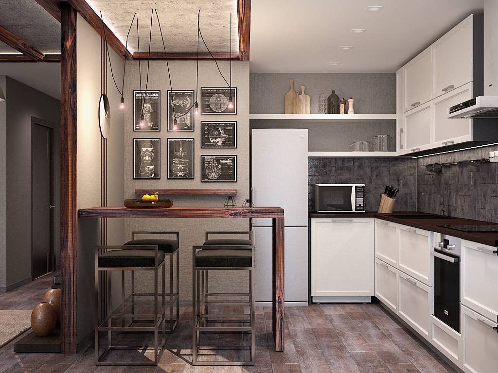 на свободные рабочие поверхности остается минимум места, поэтому в их качестве порой используют подоконники и барные стойки. Микроволновку для освобождения места лучше подвесить на кронштейнах.
