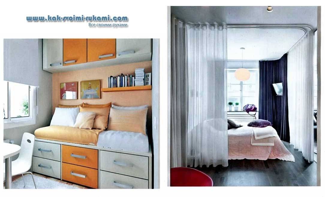 Интересен вариант так называемой кровати-подиума. В комнате обустраивается подиум, на котором можно устроить рабочую зону, а двухспальная кровать выдвигается из-под него. Конечно, самостоятельно изготовить такую мебель проблематично, придётся обращаться к специалистам, но все расходы с лихвой окупаются удобством.