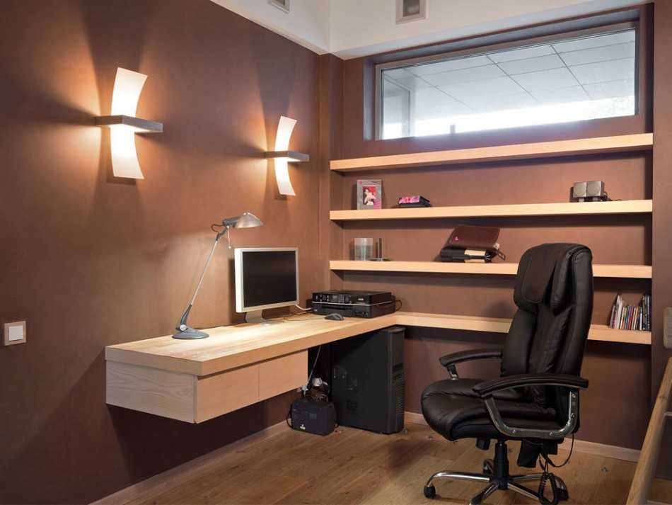 В основной части помещения необходимо установить письменный стол и удобное кресло. Для классического стиля нужна основательная мебель из массива дерева и кожи. Для хай-тека и минимализма подойдет стол с глянцевой столешницей из стекла, пластика или полированного дерева, эргономичное кресло с регулировками высоты, наклона, подлокотников, подголовника и т. п. В модерне уместны плавные линии и элементы, не приносящие практической пользы. Шкафы могут занимать всю стену, быть легкими или массивными, открытыми или закрытыми. Чаще всего нижнюю часть систем хранения делают закрытой. Сейф монтируют в стену, маскируют под тумбу или встраивают в шкаф.