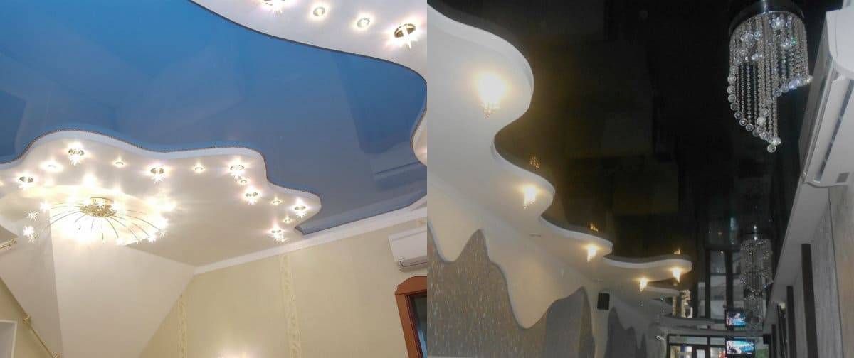 Форма потолка будет в первую очередь зависеть от формы самой комнаты. В некоторых случаях (если площадь позволяет) можно экспериментировать с более нестандартными композициями. По сути, говоря о формах конструкции, специалисты чаще всего имеют в виду дизайн потолка из гипсокартона. Именно этот материал позволяет конструировать любые фигуры. Только посмотрите на эти фото!