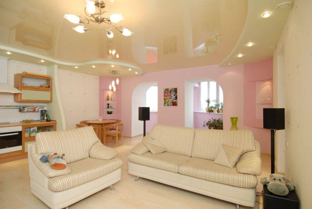 Двухуровневый. Данное оформление, не только выглядит очень красиво и позволяет воплотить любые дизайнерские задумки, но и визуально приподнимает высоту комнаты.