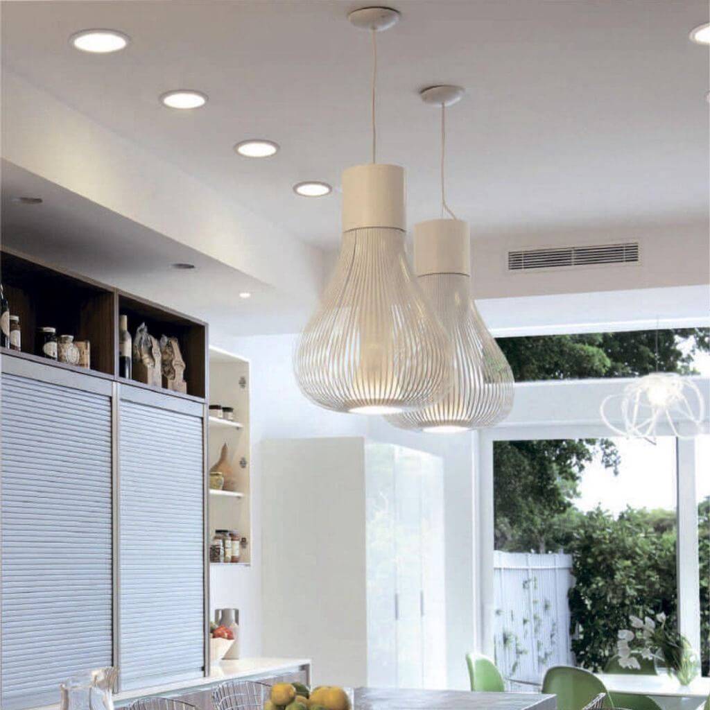 Расположить светильники в натяжном потолке можно по готовым схемам или придумать свою. Чаще их устанавливают по периметру кухни, над функциональными зонами в ряд или в форме полукруга, волны, любых геометрических фигур. Здесь следует смотреть, чтобы конечный вид соответствовал выбранному стилю. Для установки точечных источников требуется 6 – 8 см до бетонной основы, поэтому их часто располагают на нижнем уровне двухуровневого потолка, или над гарнитуром делают гипсокартонный короб произвольной формы.