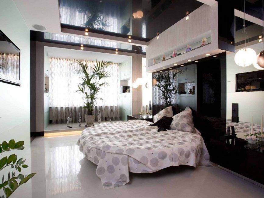 - Зеркальный эффект. Необязательно укладывать зеркало на весь потолок – можно оформить с его помощью небольшой участок поверхности.