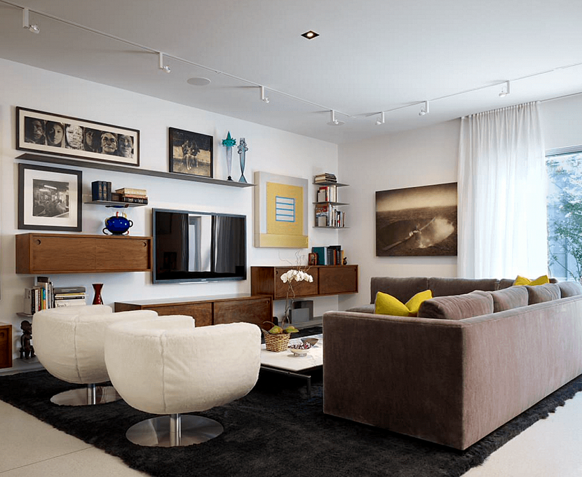 Когда помещение имеет более отчетливо вытянутую форму, то такого приема будет уже недостаточно. Необходимо добавить зонирование — например, разбить комнату примерно посередине небольшим диваном или парой кресел, удобным стеллажом или тумбой с телевизором.