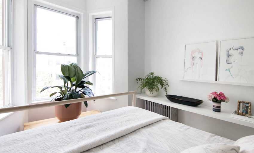 Спальня с кроватью у стены и с широкими полками для мелочей интерьераИсточник www.archilovers.com