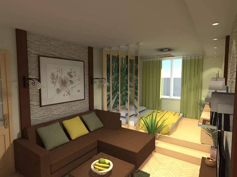 К мебели шоколадного оттенка можно подобрать текстиль жёлтого или салатового цвета. Теплая цветовая гамма наполнит комнату гармонией и уютом. Чем насыщеннее оттенок, тем меньше его должно быть в оформлении спальни-гостиной.