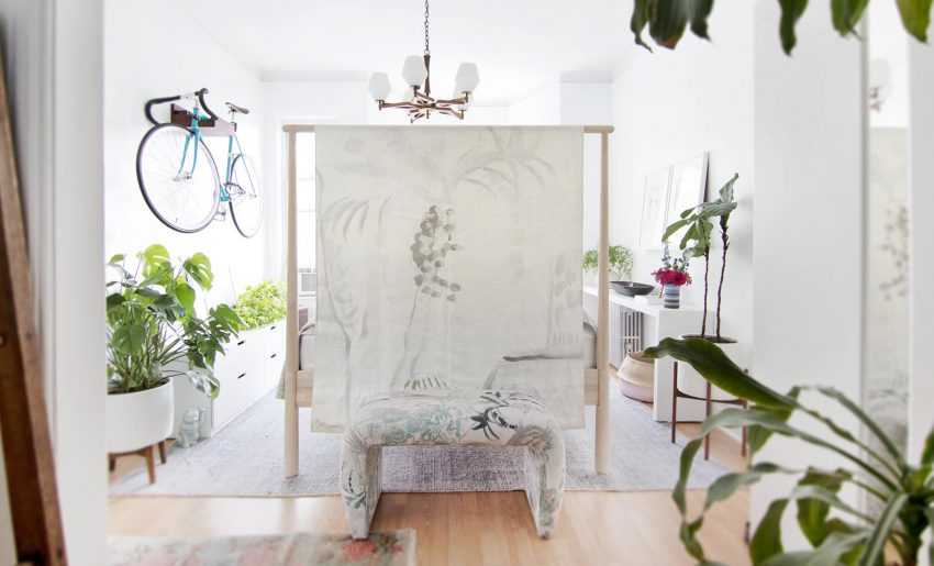 А в углу можно поставить легкий столик, торшер, горшок с комнатным растением.
