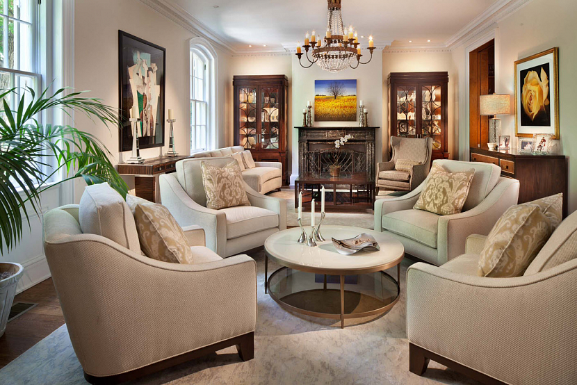 Если габариты пространства позволяют, то отлично будет смотреться любое нарушение симметрии. В частности, присмотритесь к угловым диванам и другой мебели неправильных форм, поставьте кресла и диван не вдоль стены прямоугольной гостиной или перпендикулярно ей, а под углом