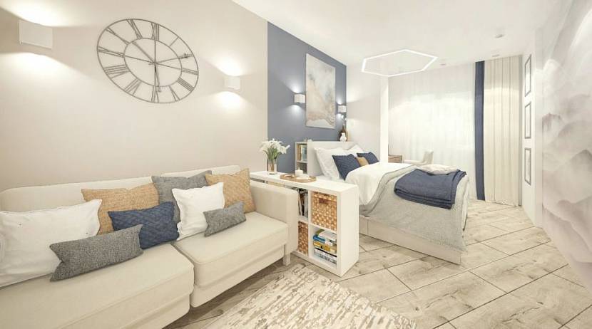 При оформлении маленьких комнат рекомендуется задействовать места под кроватью, столом, диваном, кухонным уголком. Вместо тумбочек используют настенные полки. Удачный вариант – подиум, на котором располагается спальное место, а под ним – место для хранения вещей.