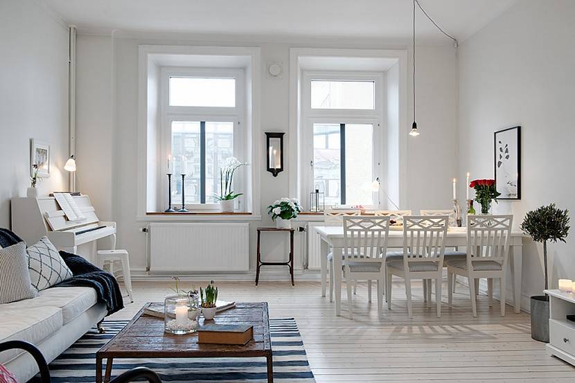 Наиболее подходящим направлением для интерьера компактной гостиной выступает минимализм. Белый цвет в отделке, лаконичность, отсутствие лишнего декора наполняет комнату воздухом и светом. Чтобы создать дома уютную атмосферу, стоит присмотреться и к скандинавскому стилю: он включает в себя почти все особенности минимализма, но приветствует хенд-мейд, теплый текстиль и домашние растения.