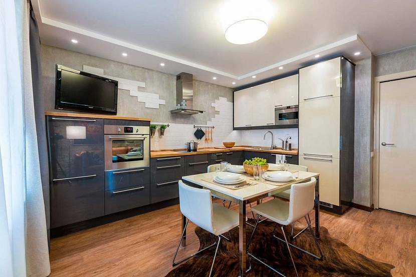 Комната, стены которой имеют равную ширину, предоставляет идеальные возможности для устройства пространства по своему вкусу. В таком помещении проще определиться с планировкой и поэкспериментировать с дизайном. Даже в самой маленькой кухне найдется места для хранения, полноценного холодильника и телевизора.