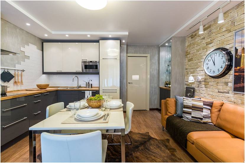 Современная кухня-гостиная – это помещение, где нет ничего лишнего: минимум декора, максимум света и свободного пространства. Поэтому для маленькой комнаты это наиболее подходящий вариант оформления.