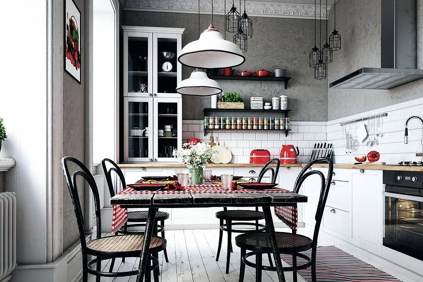 - Центральную люстру можно заменить несколькими потолочными и/или настенными лампами; освещение понадобится и над столешницей.