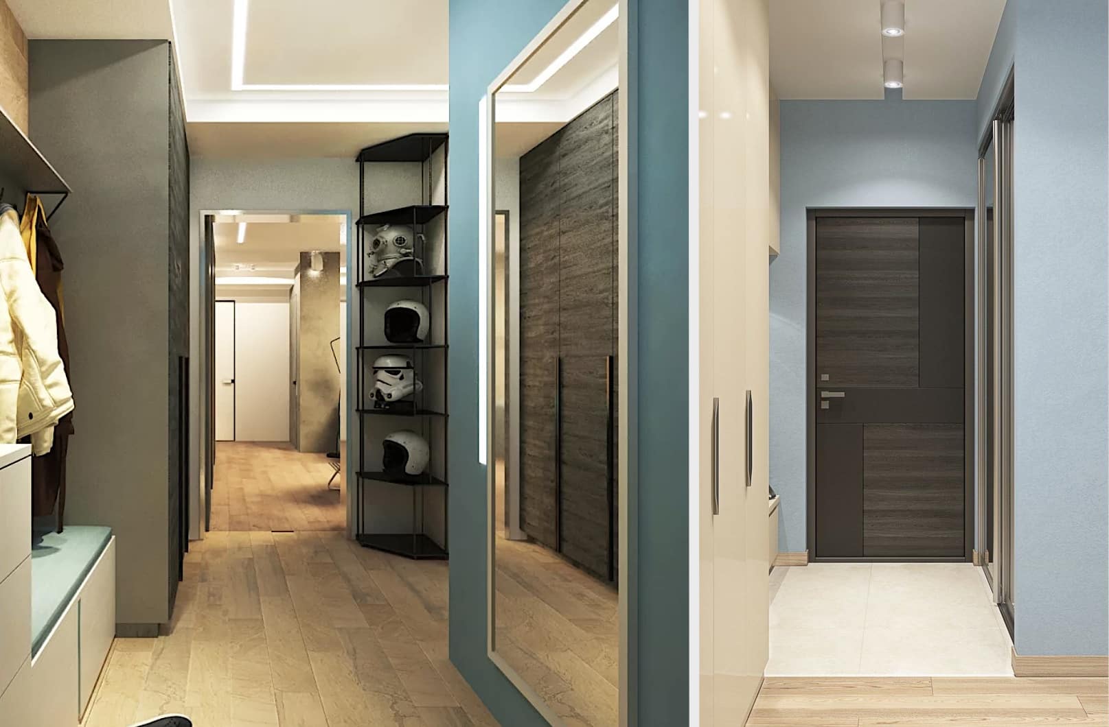 - В таком случае для дизайна коридора в квартире предлагается два варианта решения, чтобы сделать компактное и функциональное помещение: