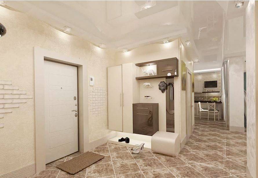 Или убрав все до стен и потолка на проходе, а саму современную прихожую в маленькой квартире, отделить от гостиной с помощью разного напольного покрытия, разноуровневых потолков и пола, декорированных встроенными точечными светильниками.
