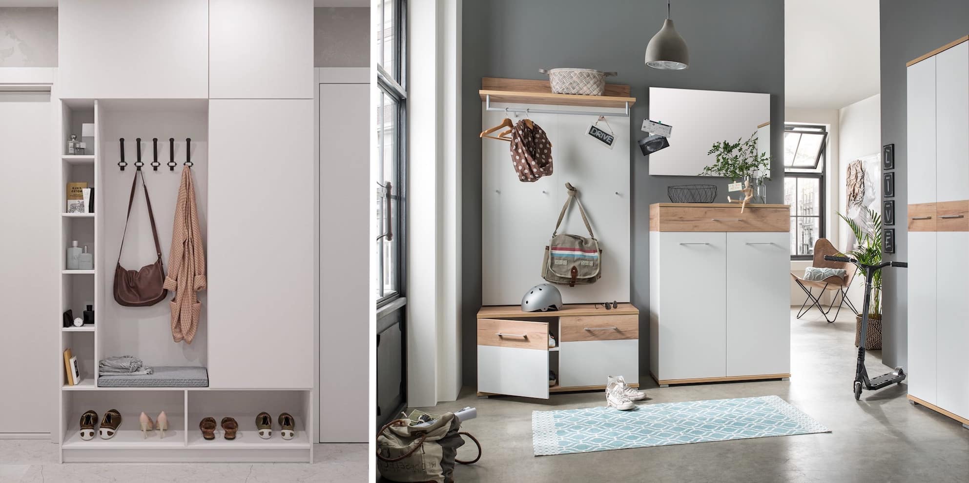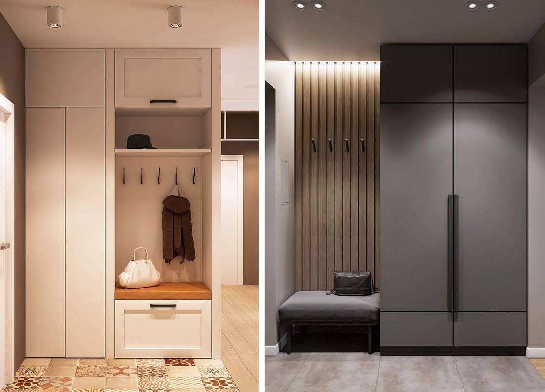 Если в квартире нет отдельной гардеробной, системы хранения в прихожей должны быть вместительными: для этого следует использовать максимум пространства, в том числе под потолком. Если шкаф имеет распашные дверцы, необходимо оставлять минимум 70 см для открытия дверей и прохода.