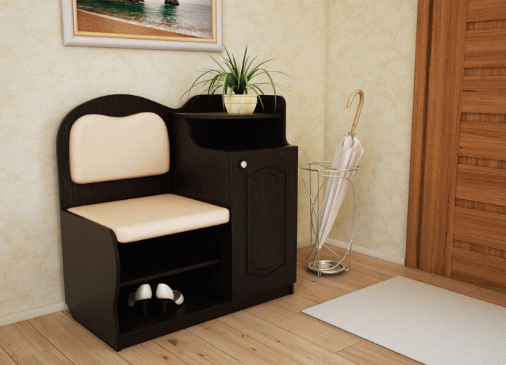 - пуфик или скамья – рекомендуется отдавать предпочтение моделям, которые оборудованы нишей для хранения обуви. Тогда можно будет приобрести небольшую обувницу, а не искать более вместительную конструкцию.