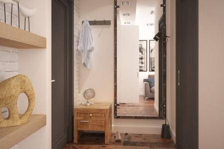 - зеркало – маленькая прихожая в хрущевке должна быть оборудована зеркалом. Но от напольных моделей лучше сразу отказаться, поскольку они занимают слишком много места. Лучше использовать те, которые устанавливаются на стену и имеют тонкую рамку;