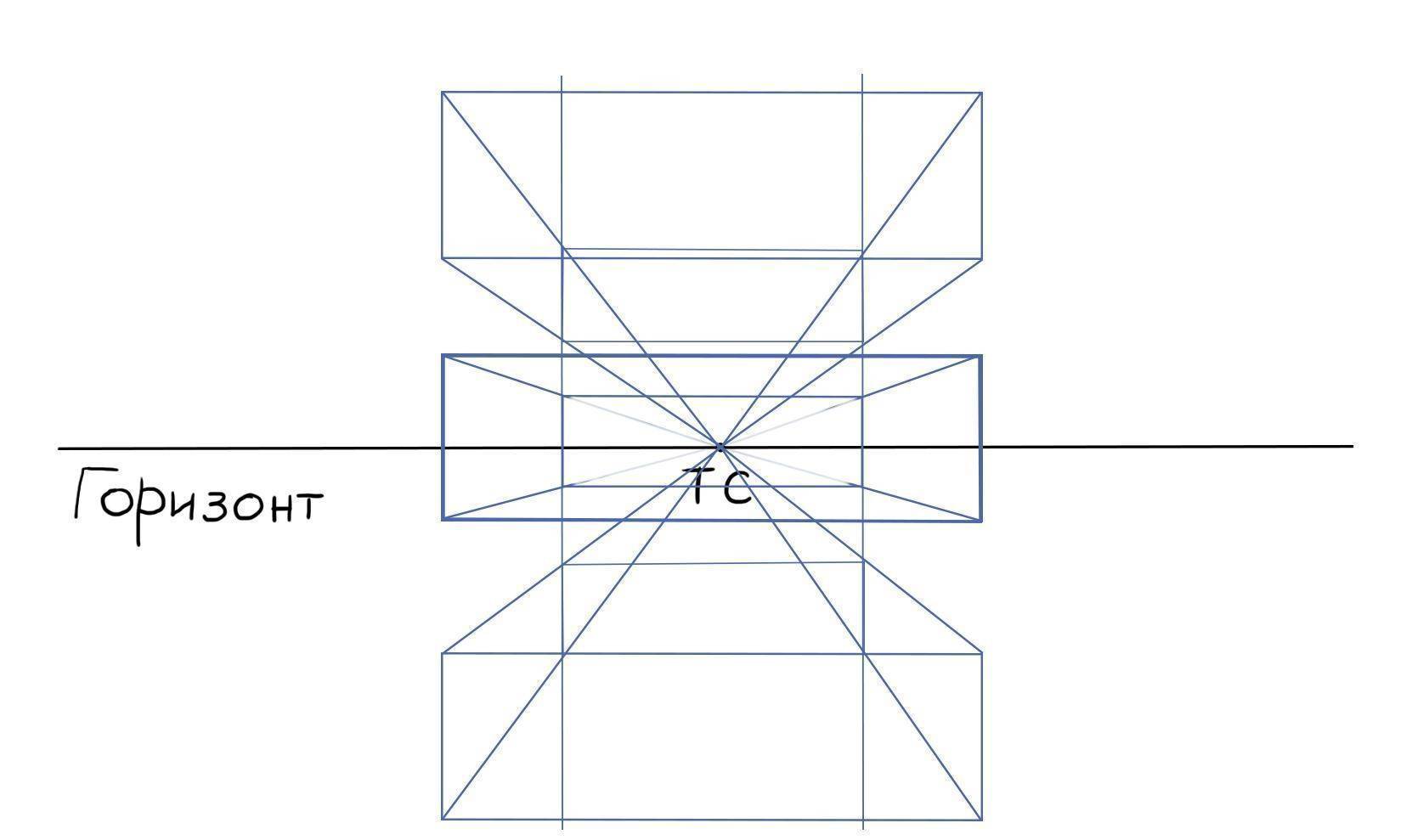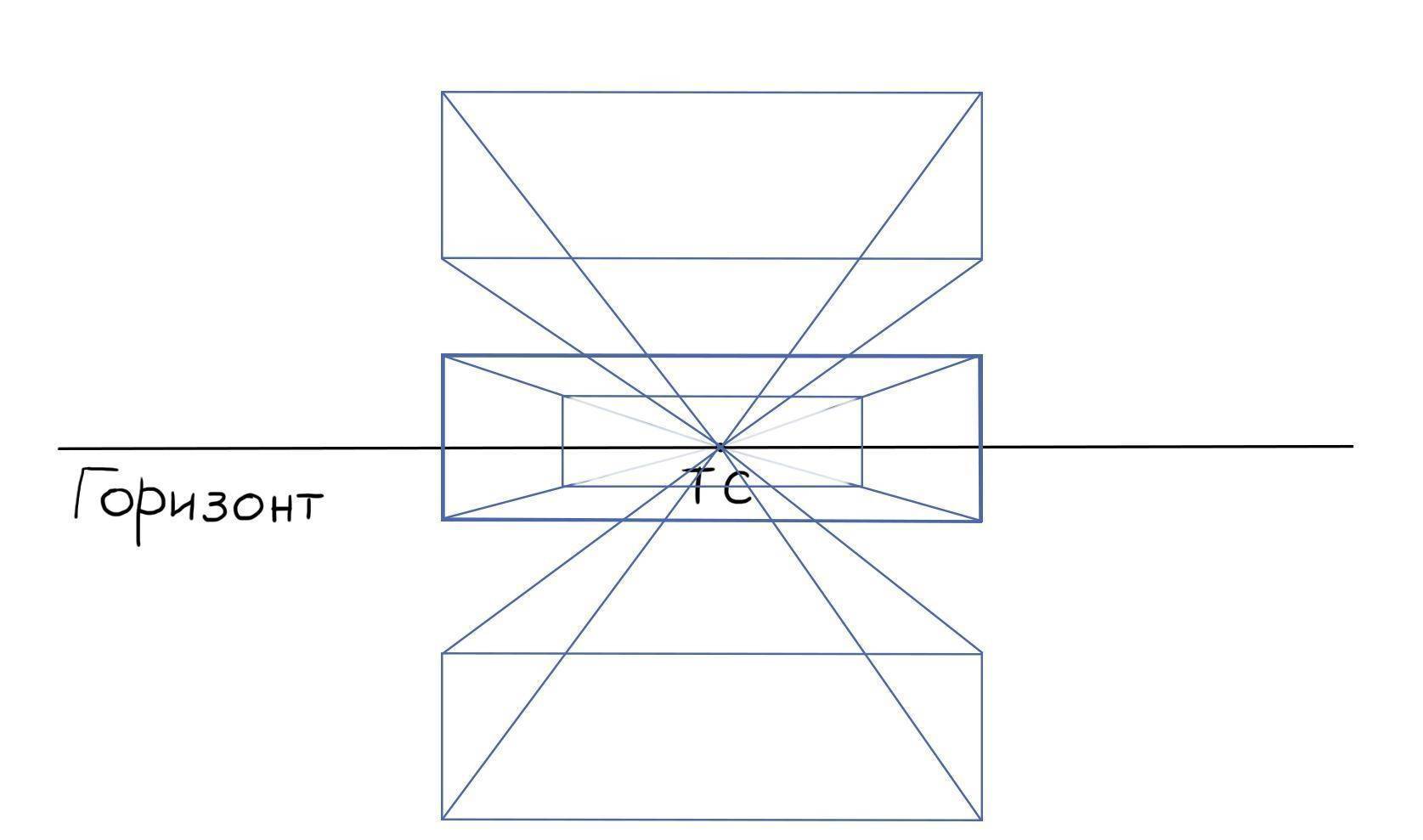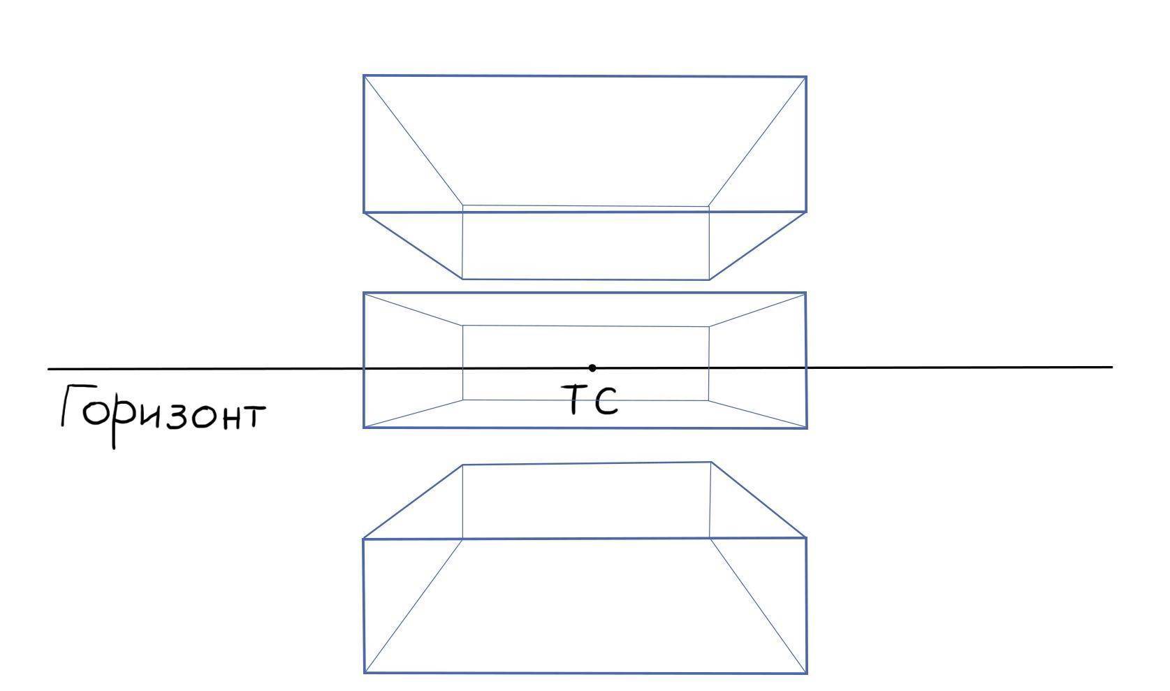 Порисуйте самостоятельно коробки разных размеров с одной точкой схода. Попробуйте нарисовать коробок, немного смещенный относительно точки схода по горизонтальной оси.