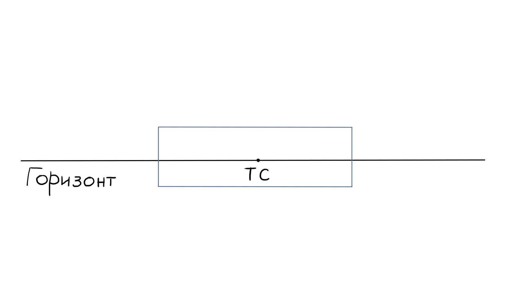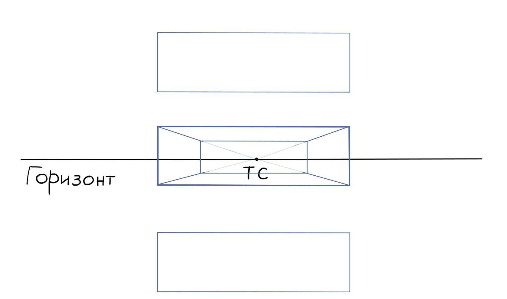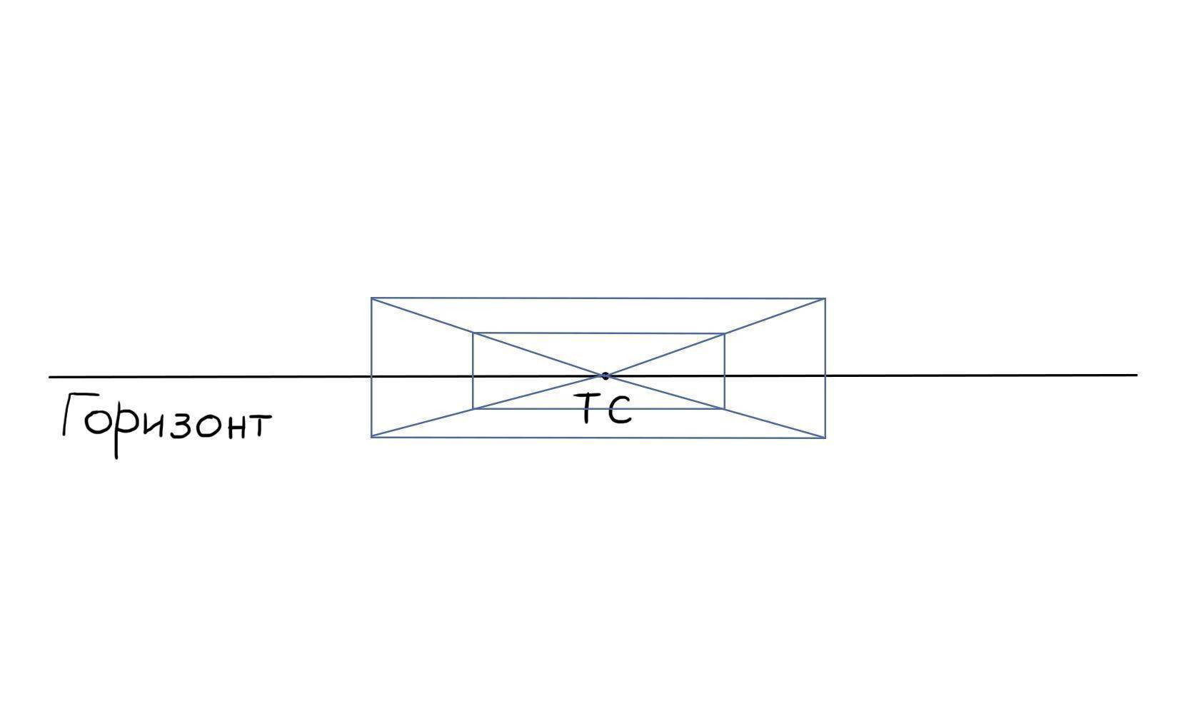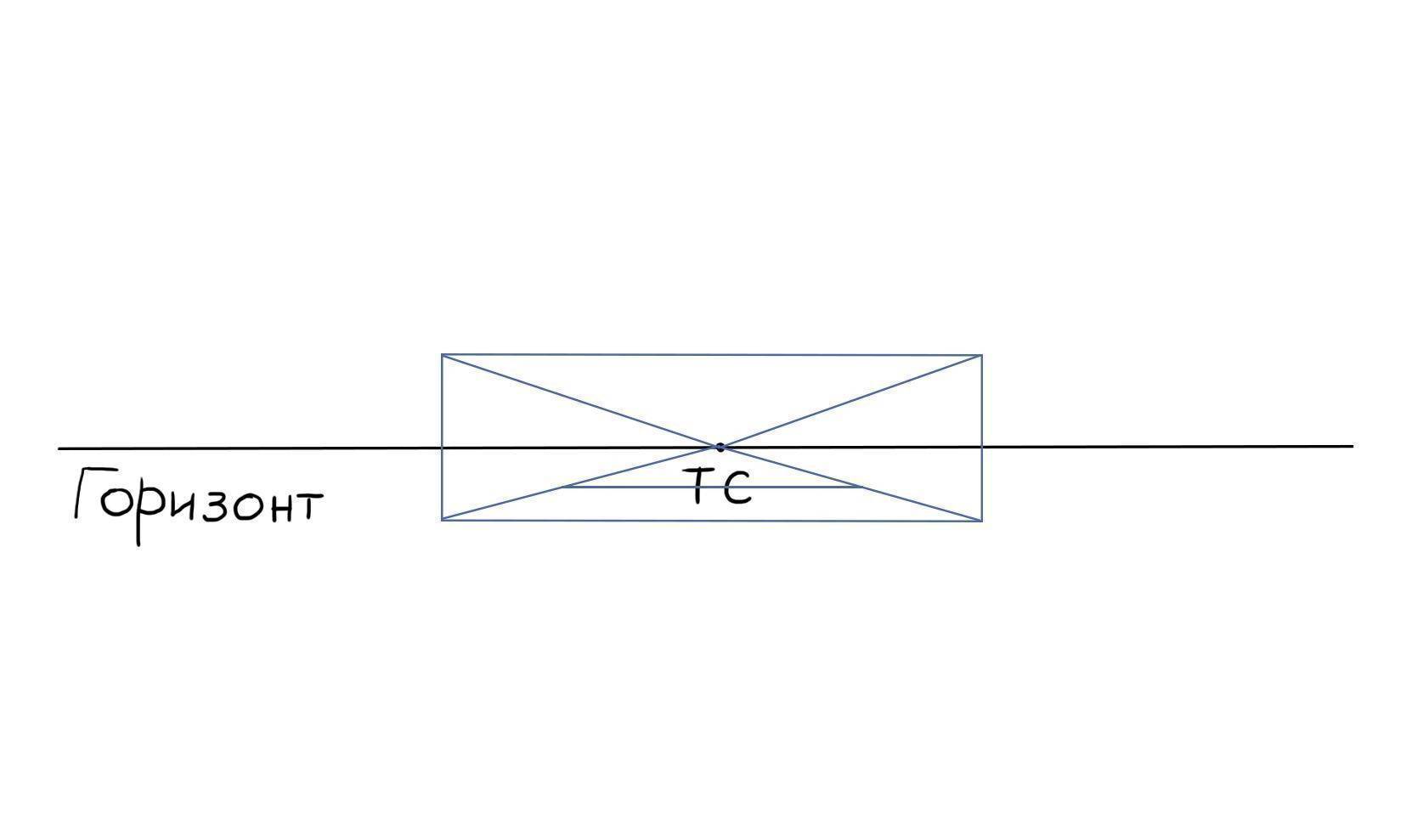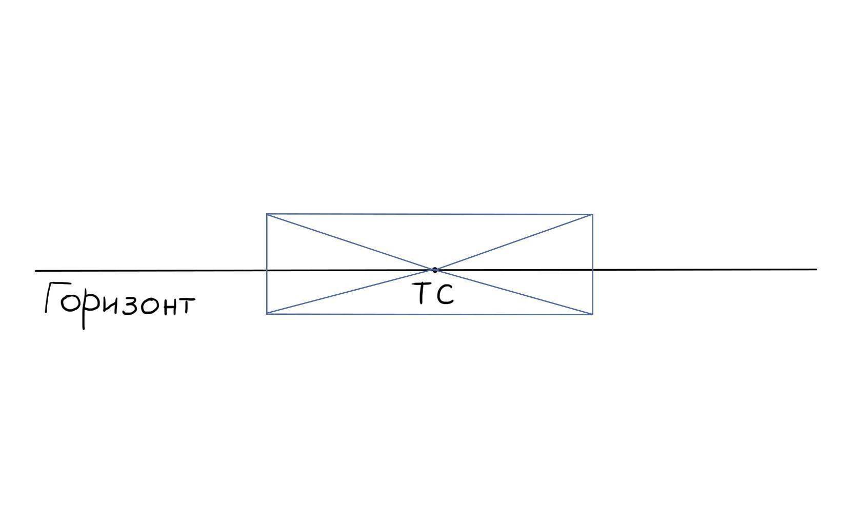 Шаг 1. Нарисуем линию горизонта и прямоугольник – переднюю плоскость коробка. Представим, что он расположен прямо перед нами, при этом не смещен ни вправо, ни влево. Поэтому точку схода (ТС) нарисуем примерно по центру прямоугольника.