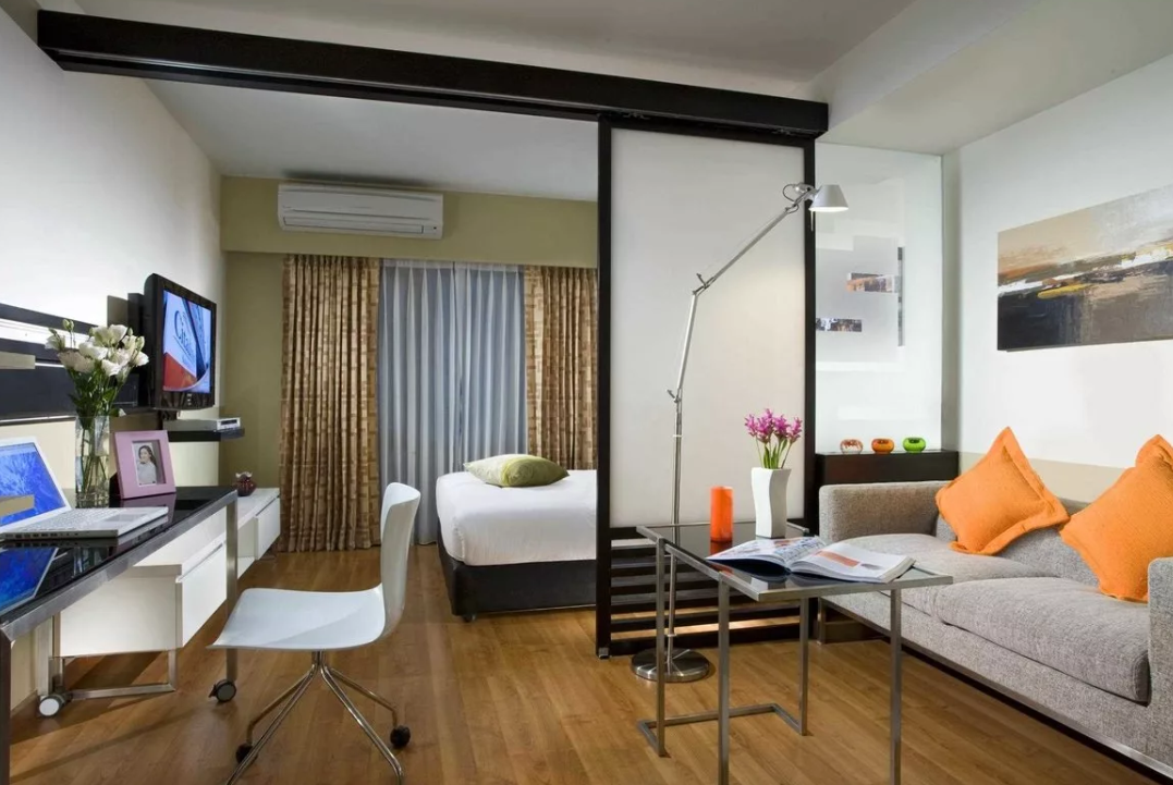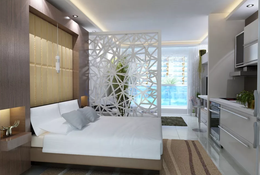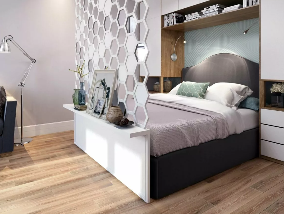 После выбора дизайна определяют вариант совмещения зон в одном пространстве. Отделить зону гостиной от спальни можно с помощью:
