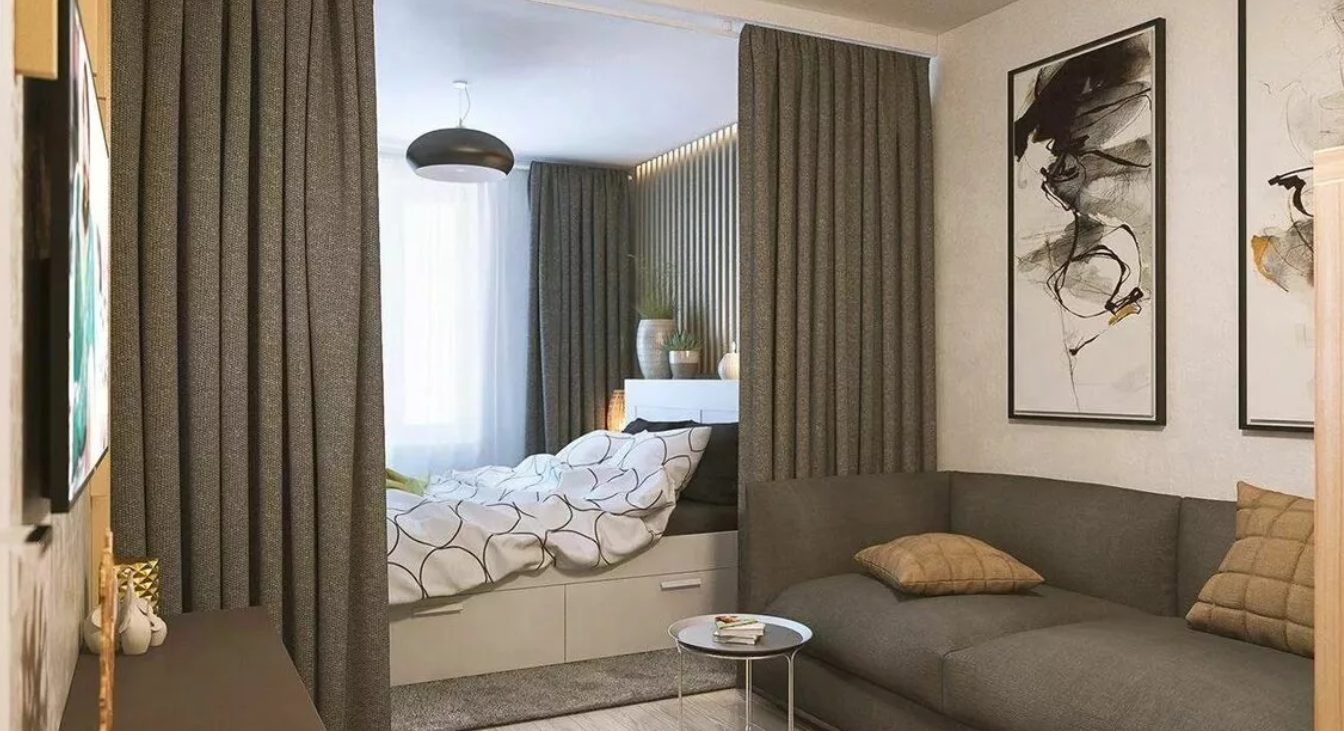 Зонирование маленькой гостиной и отделение спального местаИсточник postila.ru