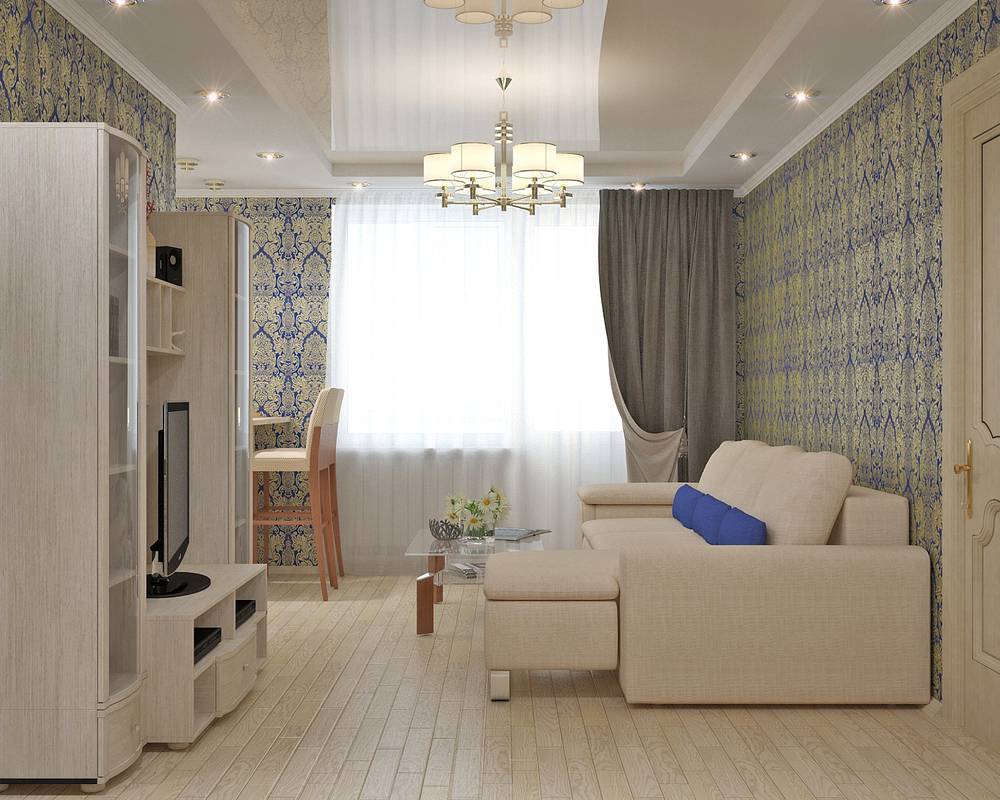 Дизайн проходной комнаты предполагает удобство и минимум деталей. Как и в случае с гостиной, интерьер комнаты в «однушке» предполагает совмещение разного рода пространств: зоны отдыха, рабочего места, спальни. В качестве элементов зонирования могут выступать перегородки, подиумы, ниши. Можно обойтись и без дополнительных конструкций, разделив пространство цветом, светом, разного рода материалами и тканью.