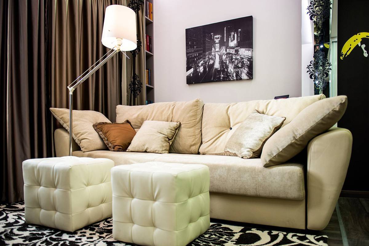 Для размещения гостей используйте не диван и не стационарные кресла, а кресла-подушки. Их легко сдвинуть и поставить одно на другое, когда кровать раскладывается на ночь.