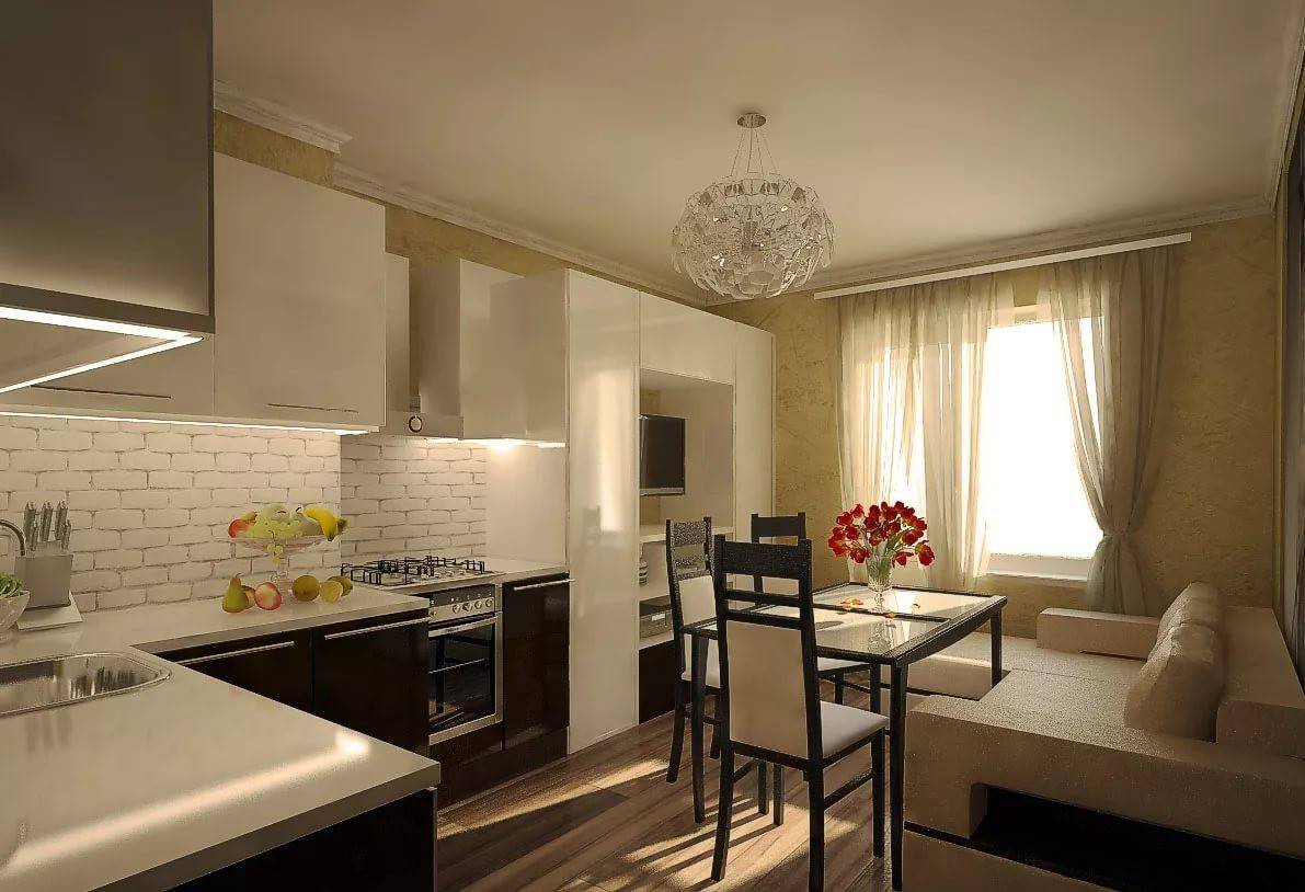 Дизайн интерьера кухни-гостиной 15 кв. м предполагает зонирование пространство исключительно цветом, небольшой барной стойкой или шкафом-тумбой. Стеллажи и ширмы сократят и без того небольшую площадь.
