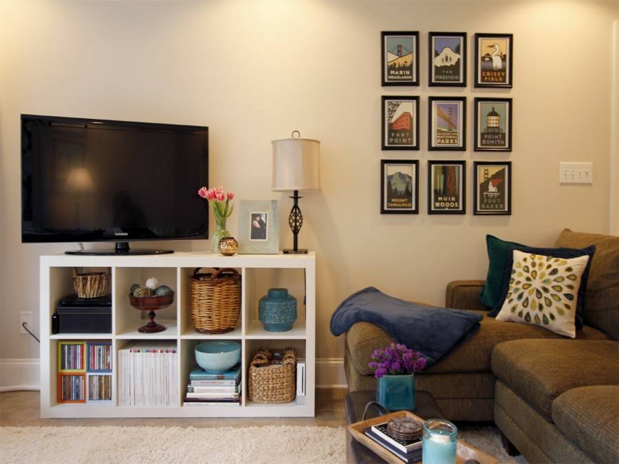 Вместо классической стенки можно разместить встроенный шкаф, а телевизор повесить на стену. Это позволит увеличить пространство для передвижения и добавит места для хранения.