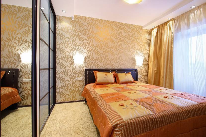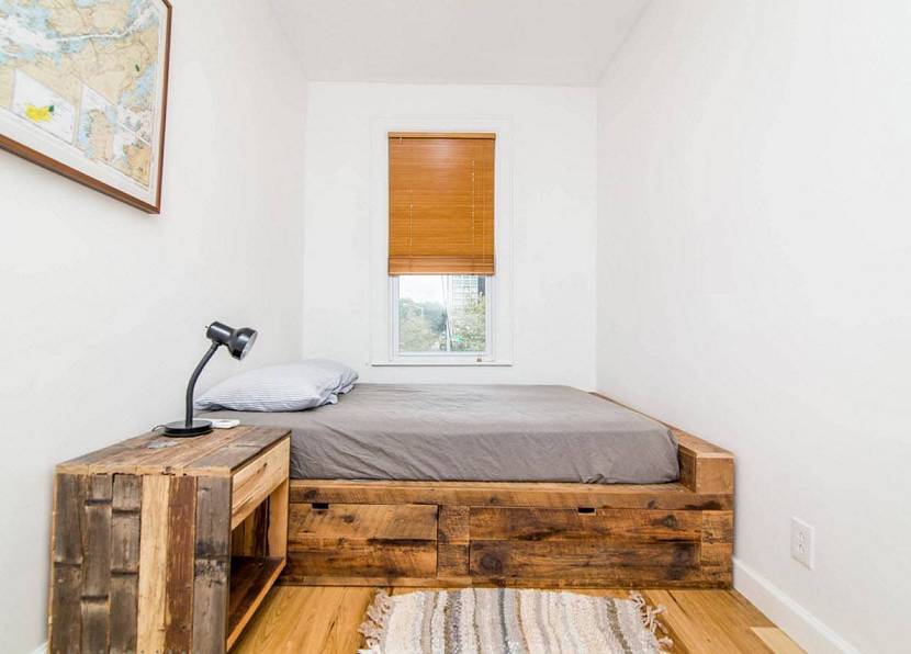 - Поставить широкую двуспальную кровать у окна, прижав ее к стенам и оставив доступ только с одной стороны. В комнате освободится место для рабочего стола или книжного шкафа. Рядом с изголовьем можно расположить полку или тумбочку, на стену повесить бра с 2 лампами.