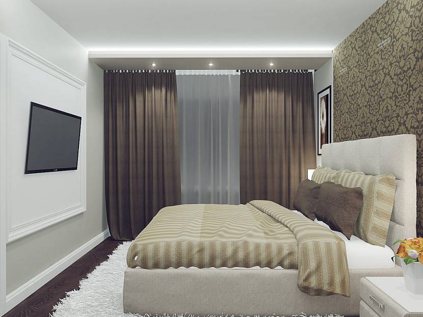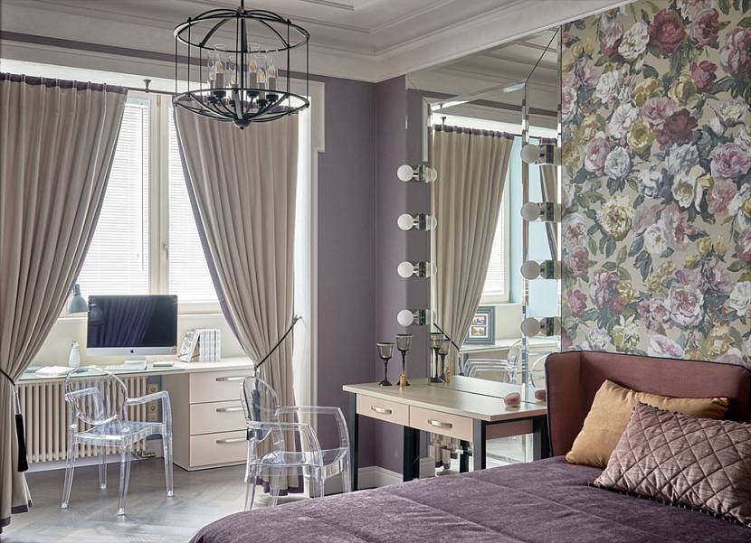 если акцент предполагается сделать на зоне кровати, то не рекомендуется приобретать яркие шторы
