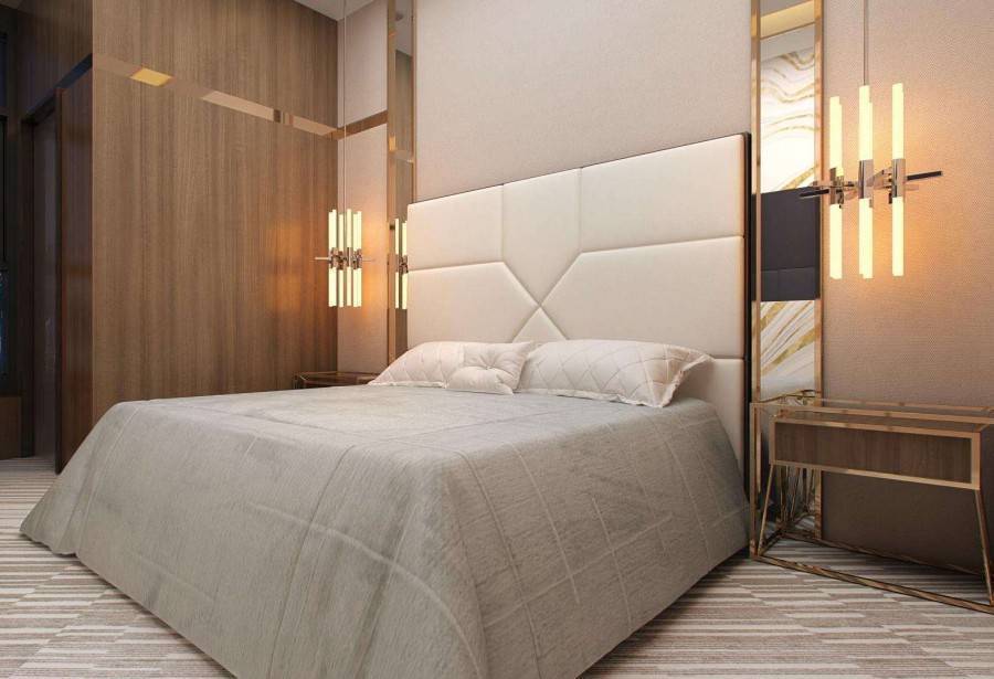 Пространство спальни не должно быть заставлено излишней мебелью, чтобы не потерялась основа интерьера в виде стен, потолка и пола