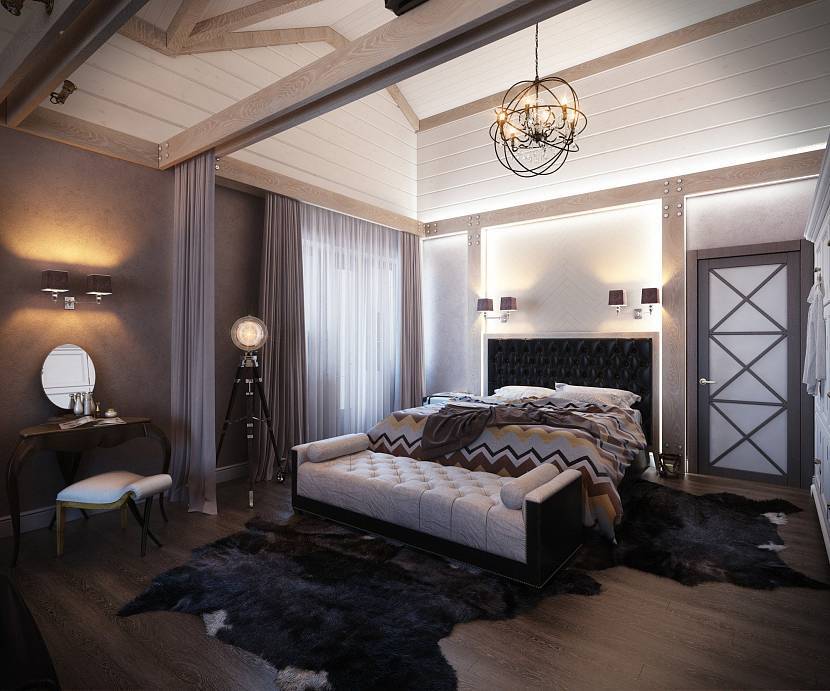 Шале. Эстетика уютных домиков лыжных курортов прекрасно впишется и в спальню дома любого российского коттеджного поселка. ДНК этого стиля — акцент на «зимние» плотные ткани, удобную низкую мебель, ретро-декор. Колеровать древесные поверхности можно как темными, так и светлыми оттенками. В такой спальне есть смысл ввести в интерьер обои. Подойдут покрытия, принтованые мелкими цветами или клеткой.