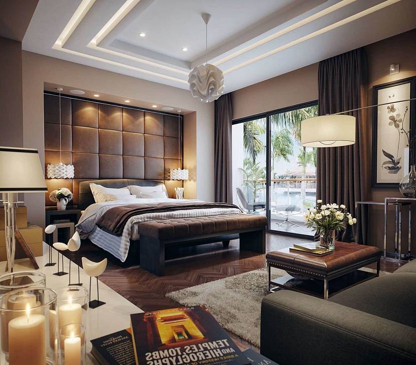 Если комната отличается большой площадью, то можно в спальной выделить зону для отдыха и тогда обязательно пригодится диван, или как минимум два кресла.